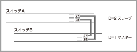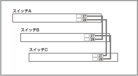 Noteスタックポートは2ポート必要なので、stackportコマンドにて1ポートのみをスタックポートに設定した場合は、デフォルトのスタックポートport1.0.27とport1.0.28のうち、番号の小さいほうが2つ目のスタックポートとなります。たとえば、port1.0.25にのみスタックポートに設定した場合は、port1.0.25とport1.0.27がスタックポートになります。また、port1.0.27にだけstackportを設定した場合は、port1.0.27とport1.0.28がスタックポートになります。