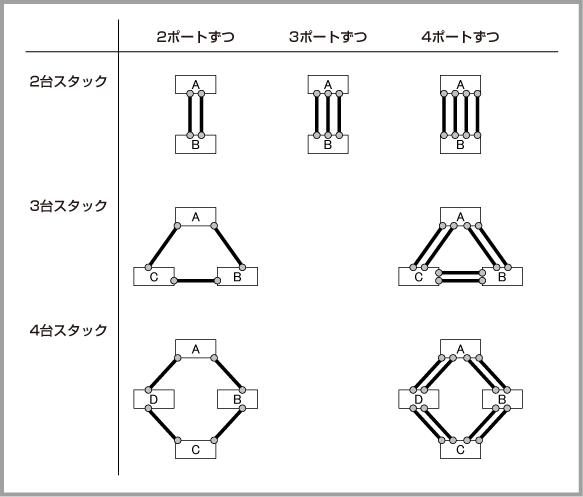 Noteスタックを組む場合、スタックポート間に他の装置をはさまず、スタックポート同士を直接接続してください。