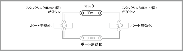 Noteマスター(ID=1)の正常起動後にポートがリンクアップして通信が可能な状態になりますが、通信が復旧するまでの時間は、ネットワーク環境と使用しているプロトコルの復旧時間に依存します。マスター(ID=1)は正常起動するまでポートをリンクアップしません。旧マスター(ID=2)も再起動中はリンクダウンするため、マスター(ID=1)がコンフィグを読み込んでから正常起動するまでの間、一時的にVCSグループの全ポートがリンクダウンしている状態になります。