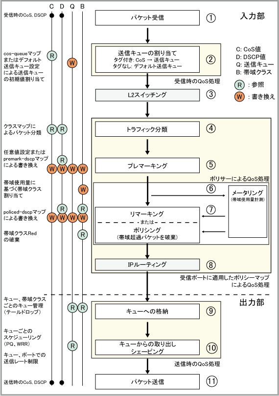 CoSとDSCPは、パケットのヘッダーに格納されうる値。パケット受信時にすでに値がセットされている場合もあれば、されていない場合もある。いずれの場合も、QoS処理の過程で変更が可能。
