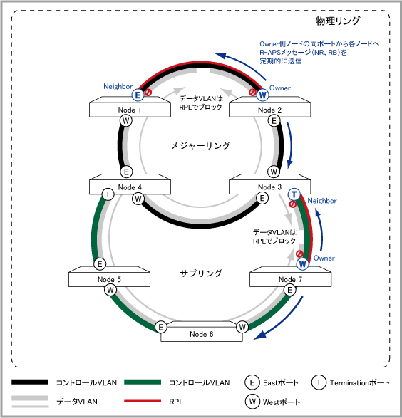 | R-APSメッセージ(NR、RB) | 障害が発生していないことと、RPLがデータVLANに対してブロッキング状態であることを示します。Ownerから同一物理リング内のノードへ送信されます。 |