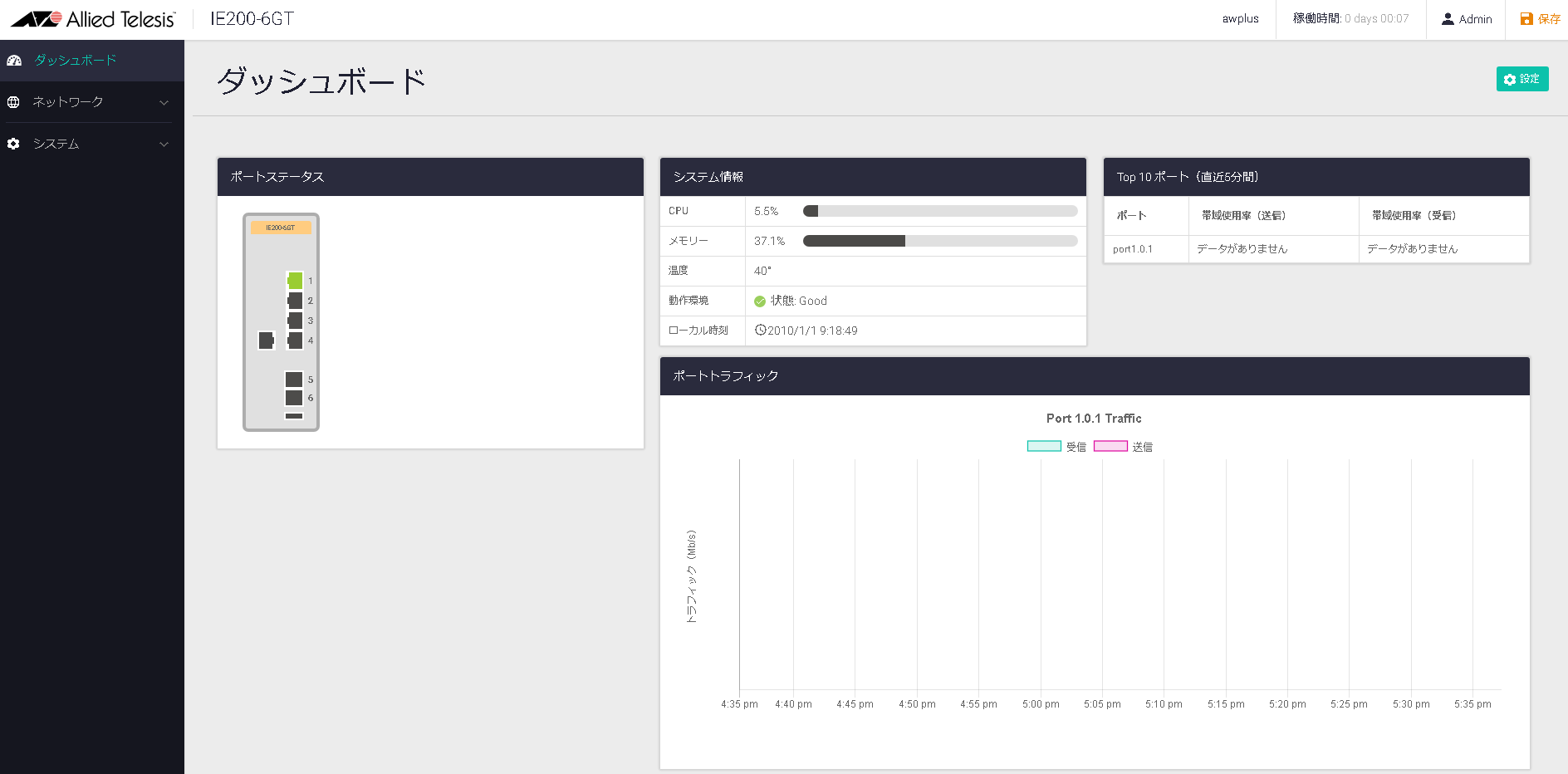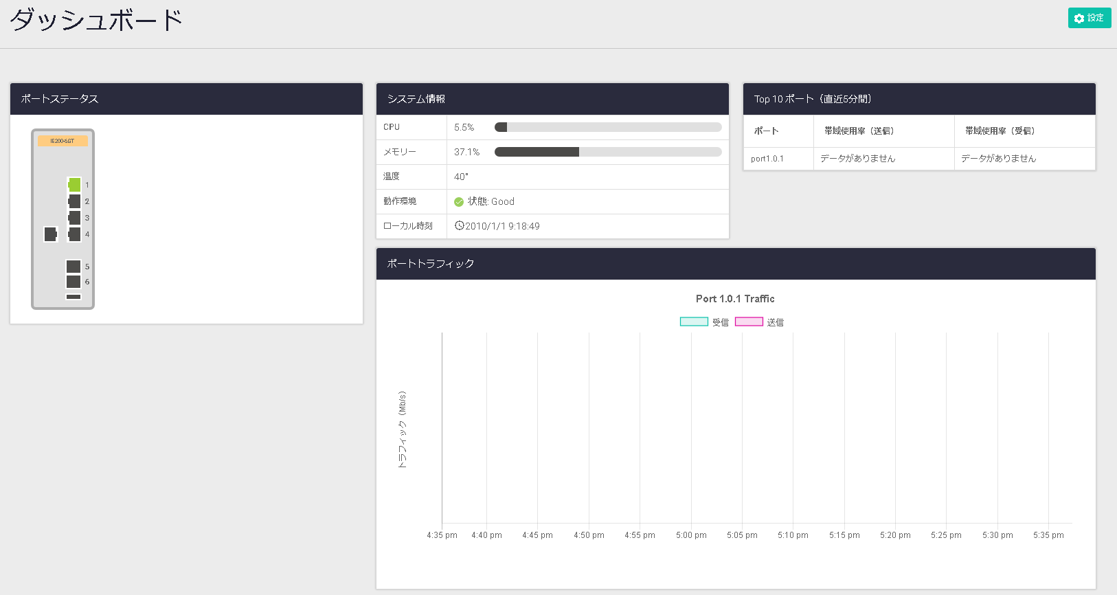 ログイン直後は、Web GUIのホーム画面であるダッシュボード画面が表示されます。