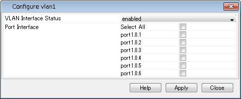 | Port Interface | 選択されたポートを、該当VLANインターフェースにおいてのルーターポートとしてスタティックに設定したい場合は、該当ポートのチェックボックスにチェックを付ける。 ただし、該当VLANインターフェースがアップしている状態(所属するポートが1ポートでもリンクアップしている状態)のみ、ポートを選択することができますので、VLANに所属するポートのいずれかをリンクアップさせた状態で設定すること。 |