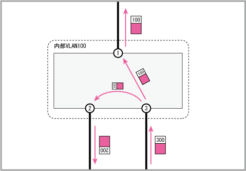 転送されたVID100のタグ付きパケットは、ポート2から出て行くときにはVID200、ポート3から出て行くときはVID300に書き換えられます。
