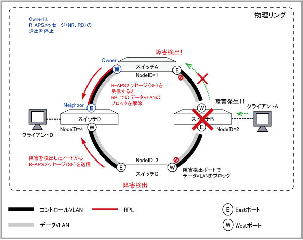 | R-APSメッセージ(NR、RB) | 障害が発生していないことと、RPLがデータVLANに対してブロッキング状態であることを示します。Ownerから同一物理リング内のノードへ送信されます。 |
