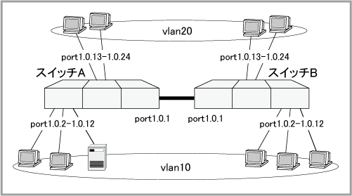 この例では、port1.0.1をタグ付きポート(トランクポート)に設定し、vlan10、vlan20両方のトラフィックがスイッチ間で流れるようにします。スイッチA、Bとも設定は同じです。