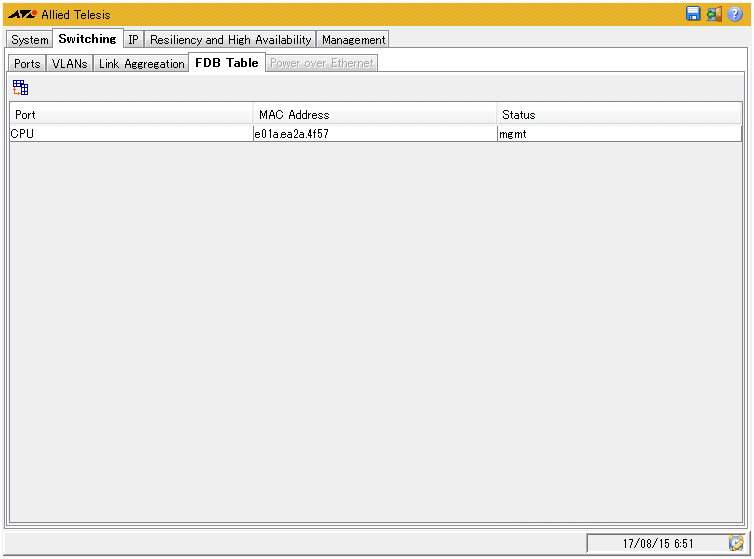 | FDB Table | フォワーディングデータベース(MACアドレステーブル)の内容を表示する。ポート番号、MACアドレス、ステータスが表示される。ステータスの意味は以下のとおり。self:自身のMACアドレス。バーチャルMACアドレスも含む。learned:ダイナミックエントリー。mgmt:スタティックエントリー |