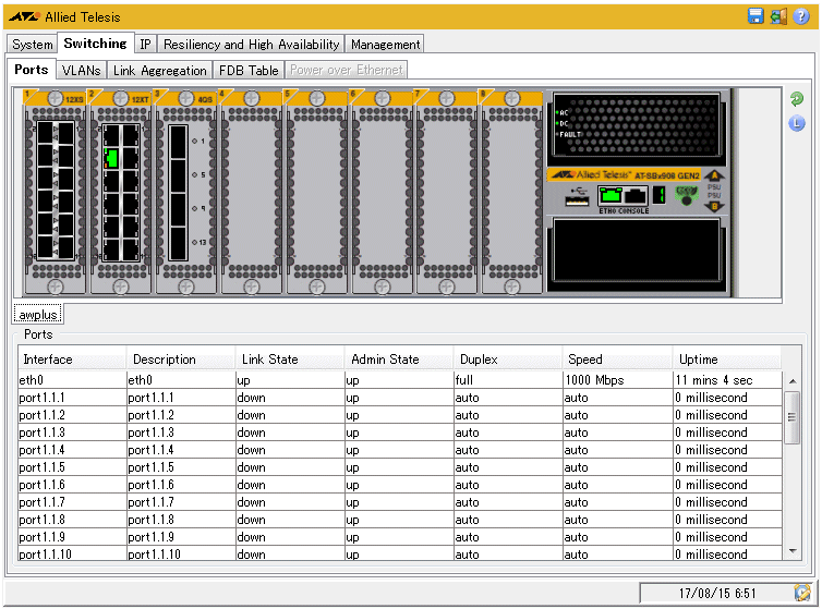 | Ports | ポート番号、リンクステータス、管理ステータス、デュプレックスモード、通信速度や稼働時間(ミリ秒単位)が表示される |