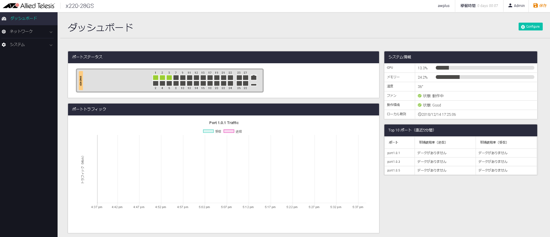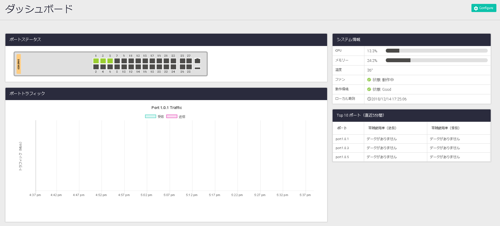 ログイン直後は、Web GUIのホーム画面であるダッシュボード画面が表示されます。
