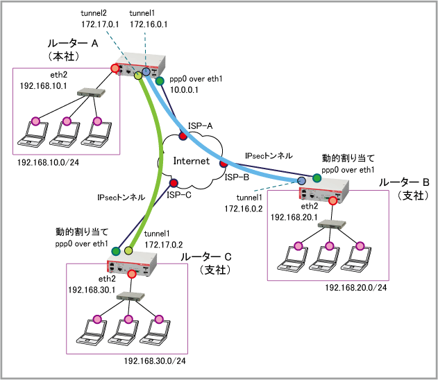 | LAN側(eth2)IPアドレス | 192.168.10.1/24 | 192.168.20.1/24 | 192.168.30.1/24 |