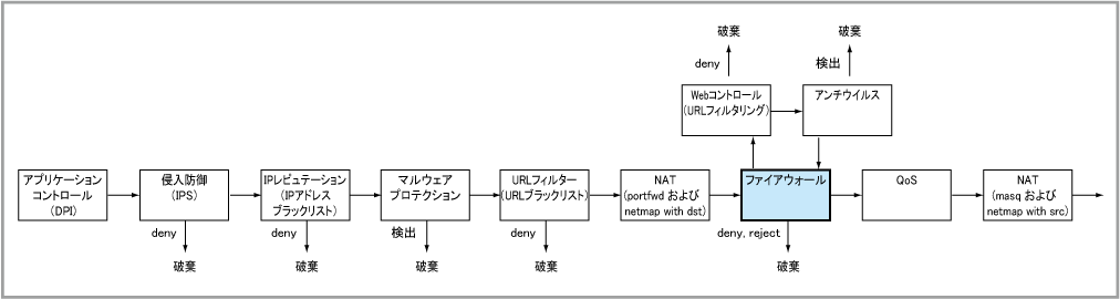 アプリケーションコントロール(DPI)機能では、各アプリケーション固有の通信パターンを検出するために一定量のパケットを受信してそのデータ部分を検査する必要がありますが、ファイアウォールはその仕様として初期設定ですべてのパケットを破棄するため、ファイアウォールとアプリケーションコントロール(DPI)を併用する場合は注意が必要です。詳しくは「UTM」/「アプリケーションコントロール(DPI)」をご覧ください。