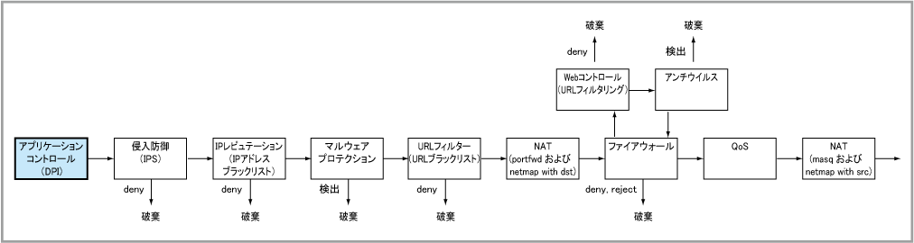 Noteアプリケーションコントロール(DPI)機能とファイアウォール機能の併用環境で、サンドバイン社の提供するアプリケーションシグネチャデータベースを使用する場合は、データベースを更新するため、本製品からインターネットへのDNS/HTTPS/SSL/TCP通信を許可する必要があります。