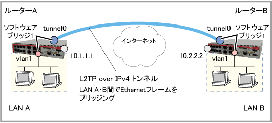 IPv4ネットワーク上にL2TPv3トンネルインターフェースを作成し、ルーターA、ルーターB配下のvlan1同士をリモートブリッジ接続し、Ethernetフレームのブリッジングを行うには、次の手順にしたがいます。