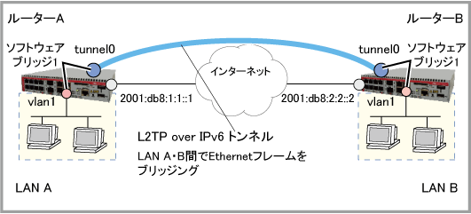 IPv6ネットワーク上にL2TPv3トンネルインターフェースを作成し、ルーターA、ルーターB配下のvlan1同士をリモートブリッジ接続し、Ethernetフレームのブリッジングを行うには、次の手順にしたがいます。
