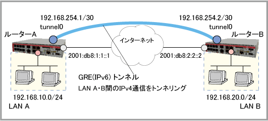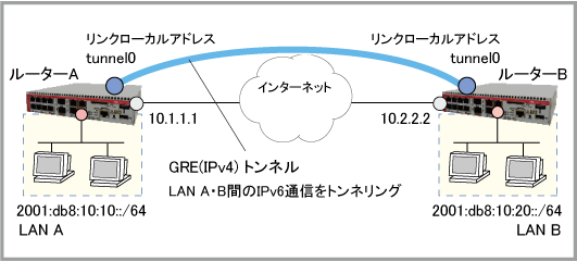 なお、前提事項として、ルーターA・BはIPv6でインターネットに接続しているものとします。WAN側インターフェースのIPv6アドレスは固定であり、ルーター間でのIPv6通信もできているものとします。