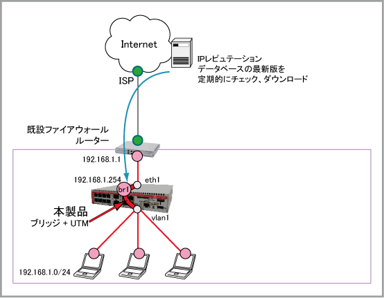 既存のルーターとスイッチの間に、ブリッジとして動作するよう設定した本製品を設置することにより、ネットワークの設定等を変更せずにUTM機能を利用可能です。