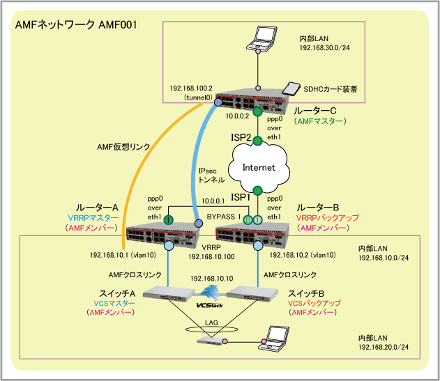 | AMF仮想リンク | ルーターA・C間:192.168.10.1(ルーターA:AMFメンバー) - 192.168.100.2(ルーターC:AMFマスター) | ||
