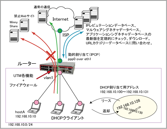 NoteIPレピュテーション(IPアドレスブラックリスト)、マルウェアプロテクション(ストリーム型アンチウイルス)、アプリケーションコントロール(DPI)、Webコントロール(URLフィルタリング)の各機能はAT-AR2050Vでは使用できません。