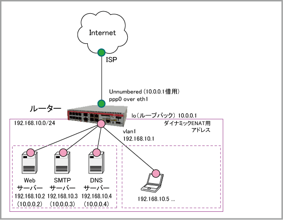 - LAN側のクライアントがインターネットにアクセスできるよう、ダイナミックENATを使用します。グローバルアドレスには、ループバックインターフェース(lo)に割り当てた10.0.0.1を使います。