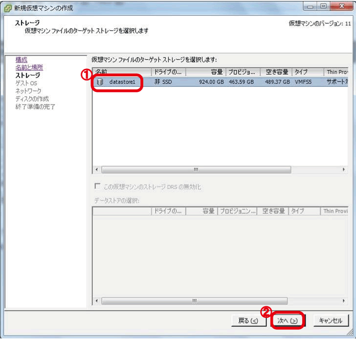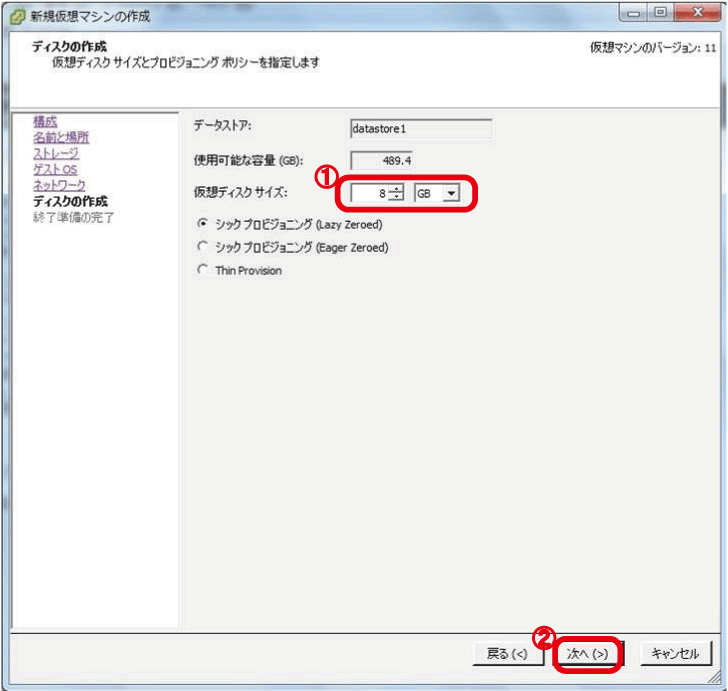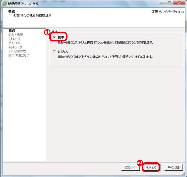 | ディスクコントローラー | 下記ドライバーで動作するもの ・PIIX4 IDE controller ・AHCI SATA controller ・BusLogic SCSI HBA ・LSI Logic SCSI HBA ・VMware PV SCSI HBA |