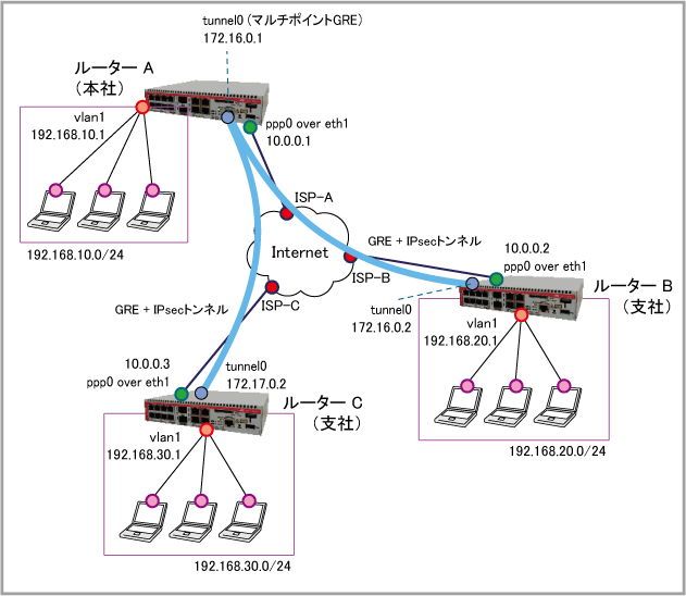 | LAN側(vlan1)IPアドレス | 192.168.10.1/24 | 192.168.20.1/24 | 192.168.30.1/24 |