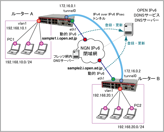 設定例集#83: ダイナミックDNSサービスを利用したホスト名(FQDN)によるフレッツ網内VPN接続(IPv4 over IPv6 IPsecトンネルによるルーティング構成)