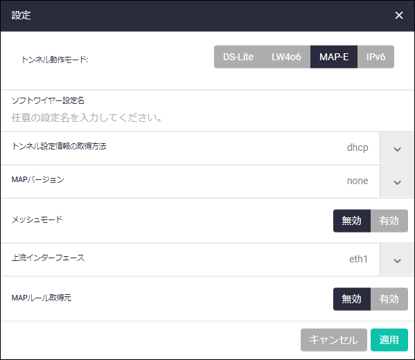 | トンネル動作モード | MAP-Eを選択してください |