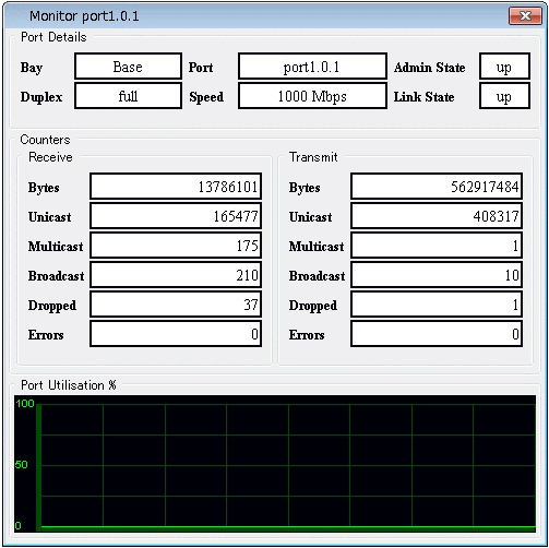 | Counters | バイト長単位で、送受信数、ユニキャストフレームの送受信数、マルチキャストフレームの送受信数、ブロードキャストフレームの送受信数、取りこぼしたフレームの数やエラーにより送受信に失敗したフレーム数が表示される |