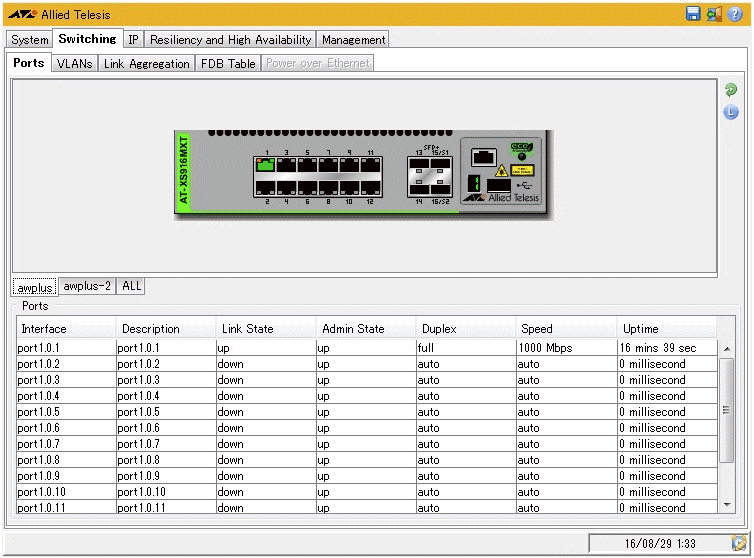| Ports | ポート番号、リンクステータス、管理ステータス、デュプレックスモード、通信速度や稼働時間(ミリ秒単位)が表示される |