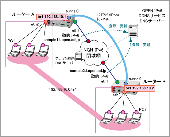設定例集#64: ダイナミックDNSサービスを利用したホスト名(FQDN)によるフレッツ網内VPN接続(ブリッジング構成)