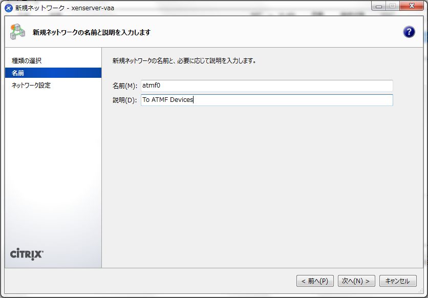 - 「新規ネットワーク」の「名前」画面で、「名前」に「atmf0」、「説明」に「To ATMF Devices」と入力して、「次へ」をクリックします。