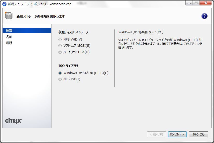 - 「新規ストレージ リポジトリ」画面の「ISOライブラリ」から、ISOイメージファイルを置く共有フォルダーの形式に合わせて、「Windows ファイル共有(CIFS)」か「NFS ISO」を選択し、その後の指示にしたがってISOライブラリを作成します。