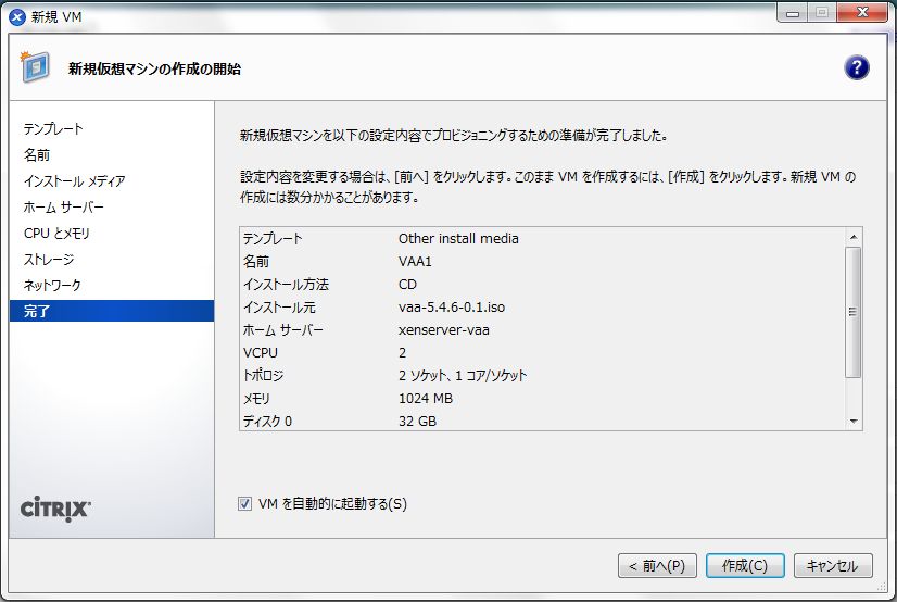 - 「新規VM」の「完了」画面では、表示されている仮想マシンの設定が正しいか確認し、「作成」をクリックしてください。