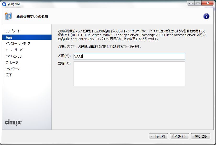 - 「新規VM」の「名前」画面では、「名前」に任意の名称を入力して、「次へ」をクリックします。
