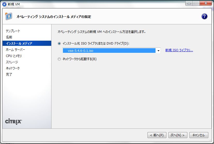 - 「新規VM」の「インストール メディア」画面では、「インストール元 ISO ライブラリまたは DVD ドライブ」から本製品のインストール用ISOイメージファイル(配布時のファイル名は vaa-X.X.X-X.X.iso の形式です)を選択し、「次へ」をクリックします。