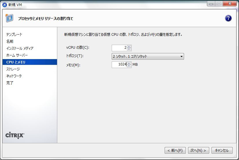 - 「新規VM」の「CPUとメモリ」画面では、「vCPUの数」を「2」に、メモリを「1024MB」に設定して、「次へ」をクリックします。