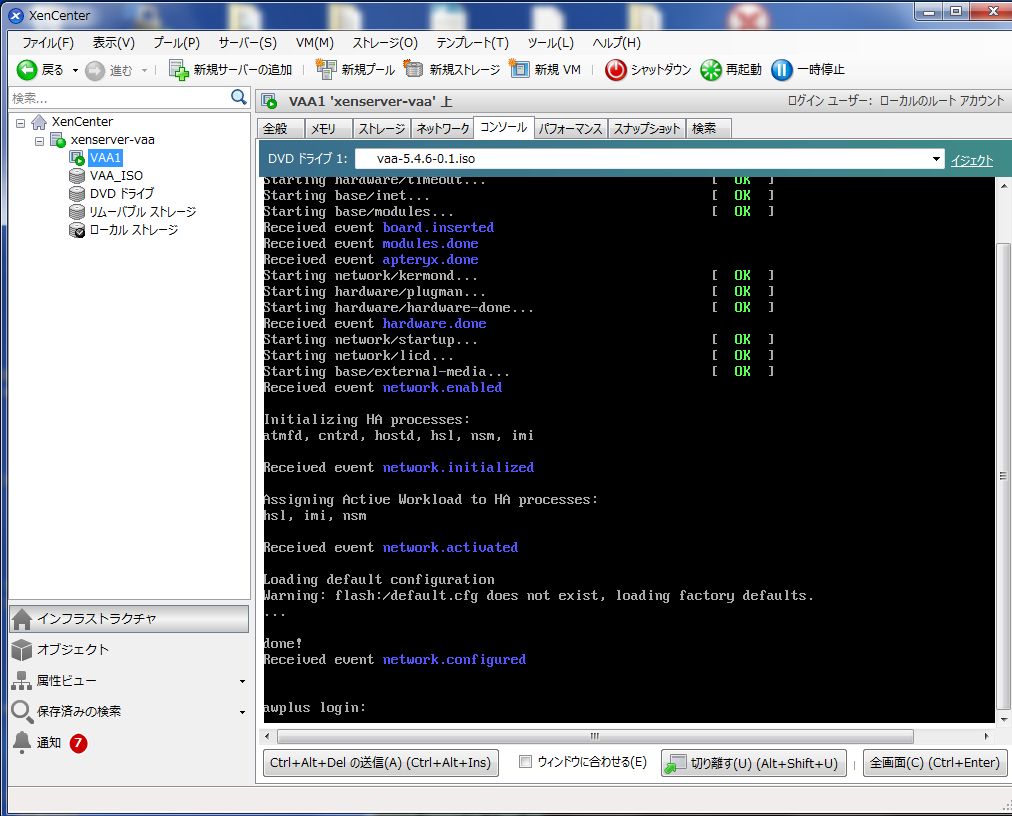 - XenCenterの左ペインから本製品の仮想マシンを選択した状態で「コンソール」タブを開きます。