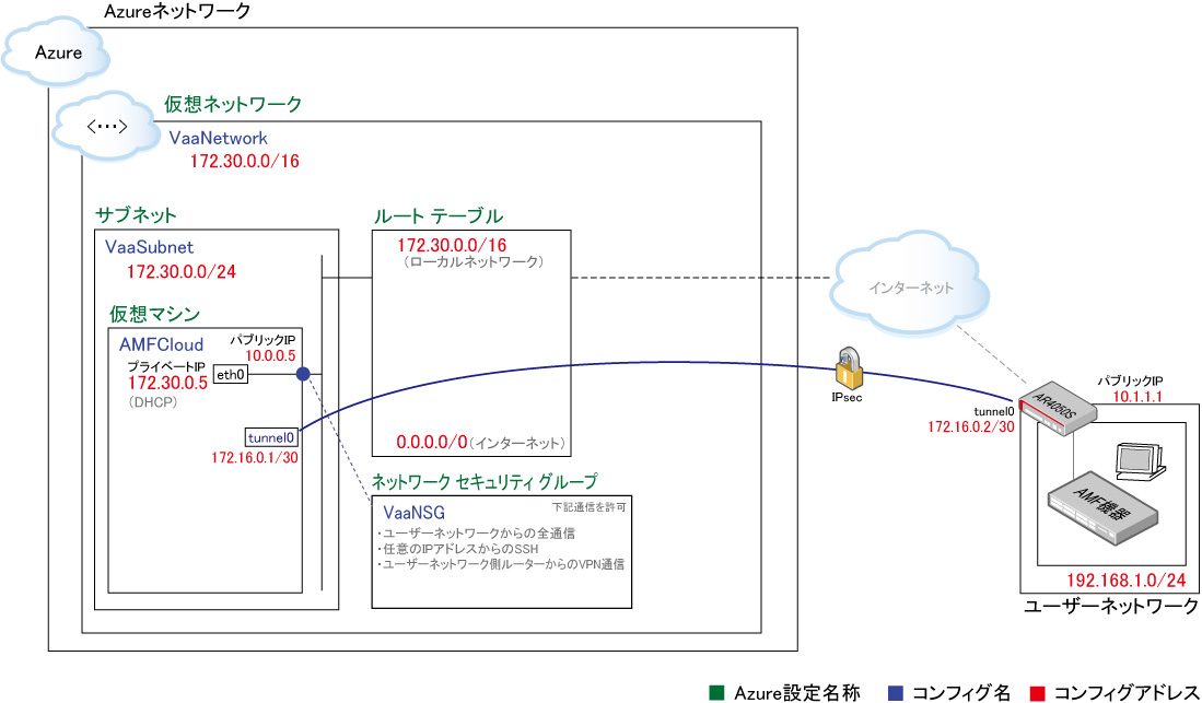 シングルモードの場合、ユーザーネットワークとの間にIPsec VPNを構築し、本製品とユーザーネットワーク上のAMF対応機器が安全に通信できるようにします。