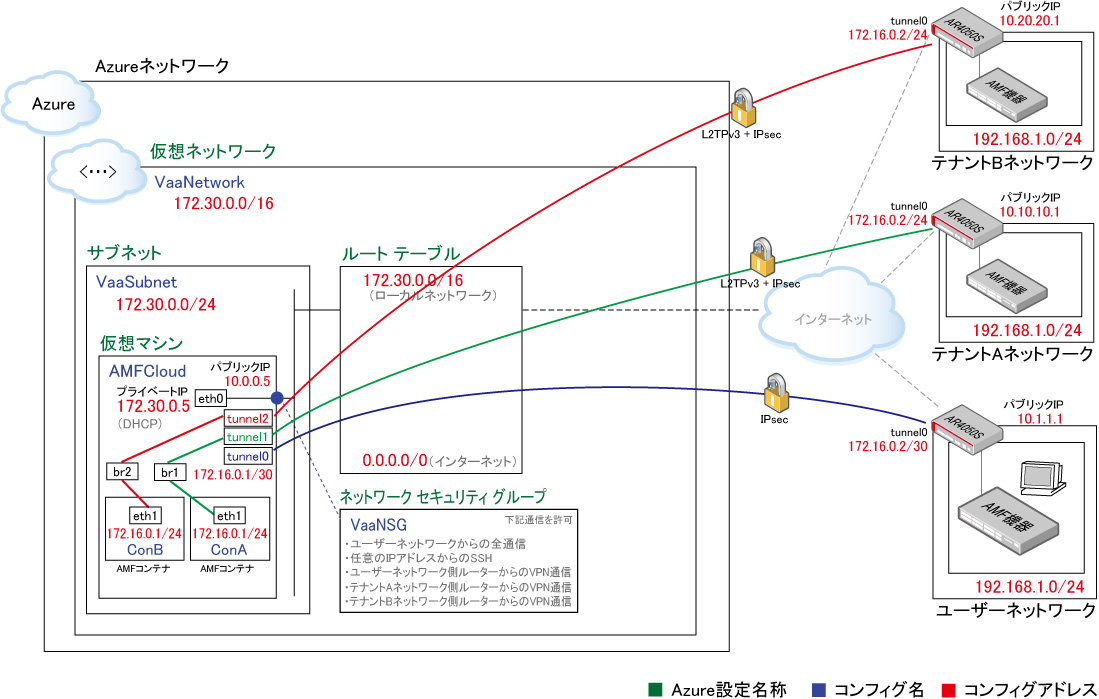 なお、この構成では、仮想ネットワークゲートウェイからAMF Cloud(マルチテナントコントローラー)および各コンテナまでの通信経路が共有のIPネットワークになっているため、各テナントで独自のIPアドレス設計を行うことはできません。