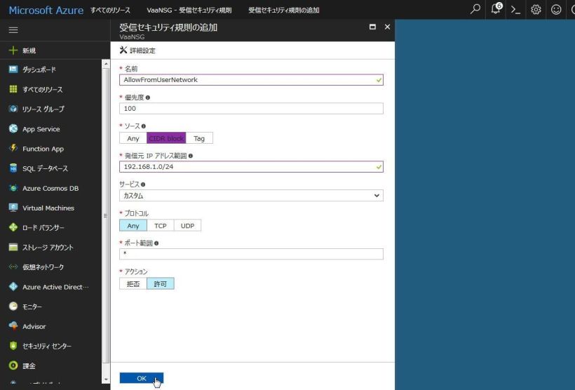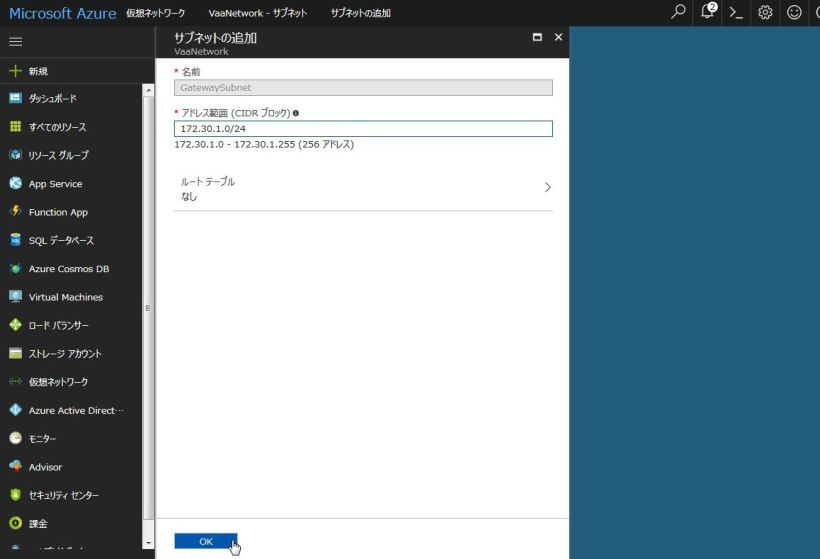 「ルートの追加」ブレードで各項目に適切な値を入力し、「OK」ボタンをクリックします。
