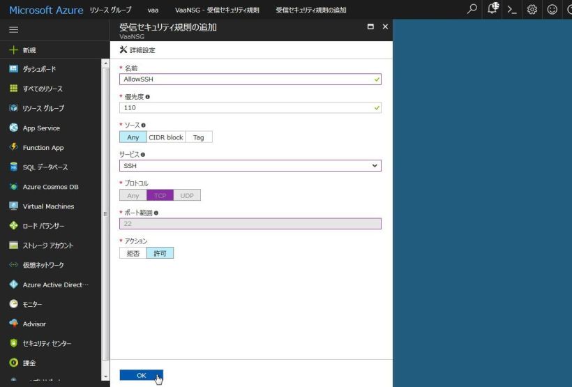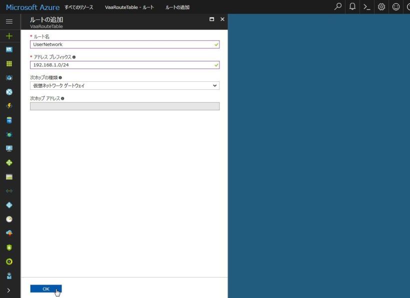 「VaaRouteTable - ルート」ブレードで「+ 追加」をクリックし、「ルートの追加」ブレードで各項目に適切な値を入力し、「OK」ボタンをクリックしてください。