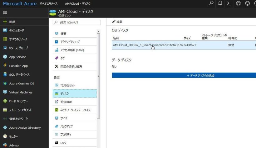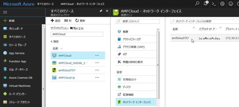 - Azureポータルから、「すべてのリソース」を選択し「名前でフィルター...」欄に「AMFCloud」と入力すると、「名前」欄に「AMFCloud」が表示されるので、これをクリック。続いて「ネットワーク インターフェース」を選択してその右に表示される名前をクリックします。