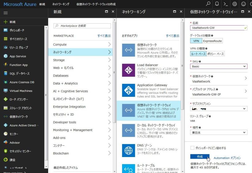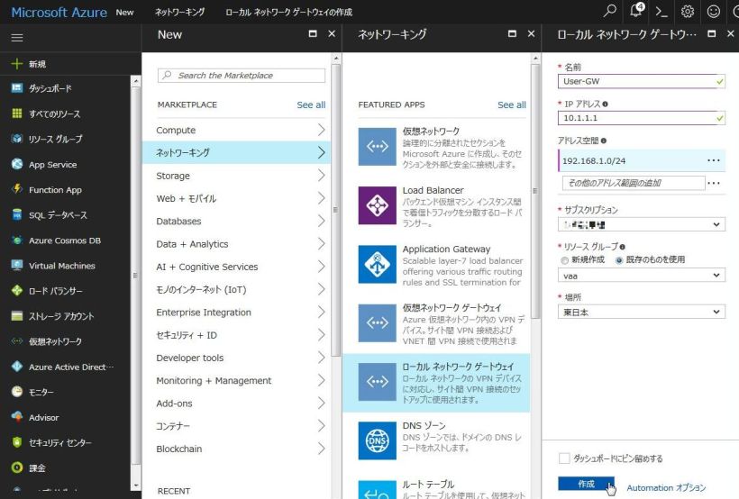 Azureポータルから、「+ 新規」>「ネットワーキング」>「ローカル ネットワーク ゲートウェイ」の順にメニューを選択します。
