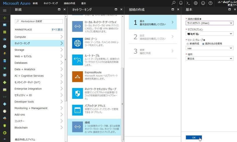 Azureポータルから、「+ 新規」>「ネットワーキング」>「接続」の順にメニューを選択します。