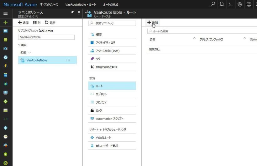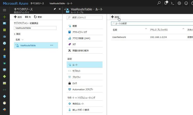 - Azureポータルから「すべてのリソース」を選択し「名前でフィルター...」欄に「VaaRouteTable」と入力すると、「名前」欄に「VaaRouteTable」が表示されるので、これをクリック。続いて「ルート」>「+ 追加」の順にクリックします。