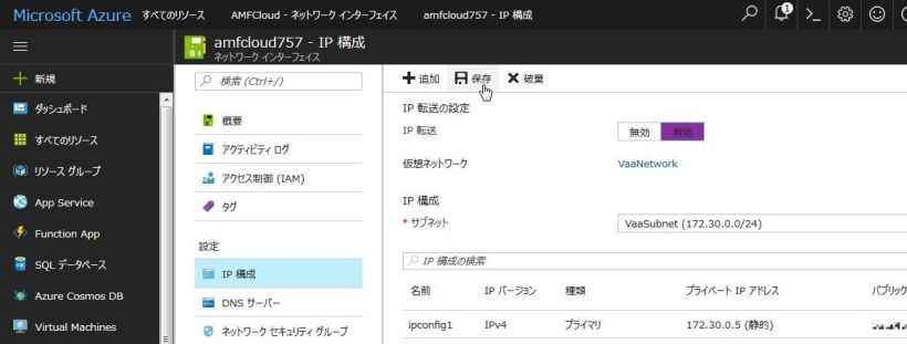 - 「XXXX」ブレードで「IP構成」をクリックし、「XXXX - IP構成」ブレードの「IP転送」を「有効」に変更して、「保存」をクリックします。