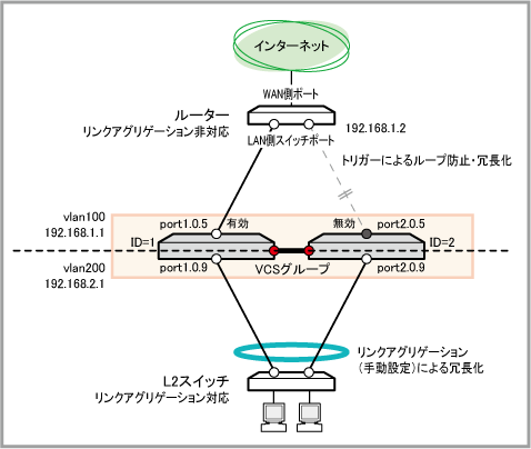 対向の2ポート(ルーター側の2ポート)は、ルーターのLAN側スイッチポートを想定しています。ルーターにスイッチが内蔵されていない場合は、VCSグループとルーターの間にスイッチをはさむ必要があります。