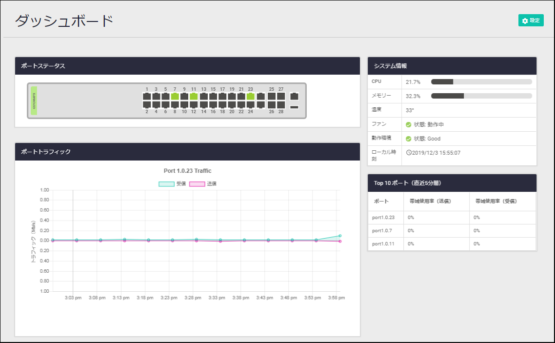 ログイン直後は、Web GUIのホーム画面であるダッシュボード画面が表示されます。