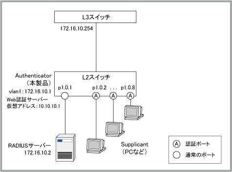 本製品を使ってポート認証のシステムを運用するために最低限必要な設定を示します。