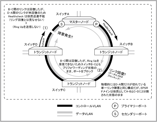 Noteマスターノードがダウンしている場合やエンハンストリカバリーに対応していない場合、他にも障害箇所があってマスターノードと通信できない場合などは、PLFメッセージを受信できませんが、その場合はマスターノード不在、すなわち、リングが完全でない(ループしていない)とみなし、一定時間後にプリフォワーディングからフォワーディング状態に遷移し、ポートのブロッキングを解除します。